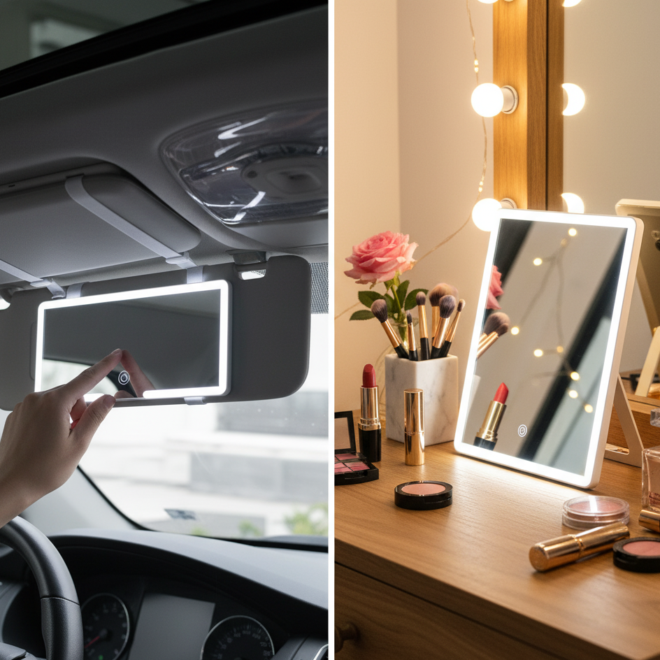 המראה מתחברת למגן השמש ברכב בשניות, ומאפשרת איפור נוח ומדויק גם בדרכים. בסוף היום אפשר להסיר אותה בקלות ולהניח על שולחן האיפור בבית, עם אותה תאורת LED איכותית שמבטיחה תוצאה מושלמת בכל מקום.